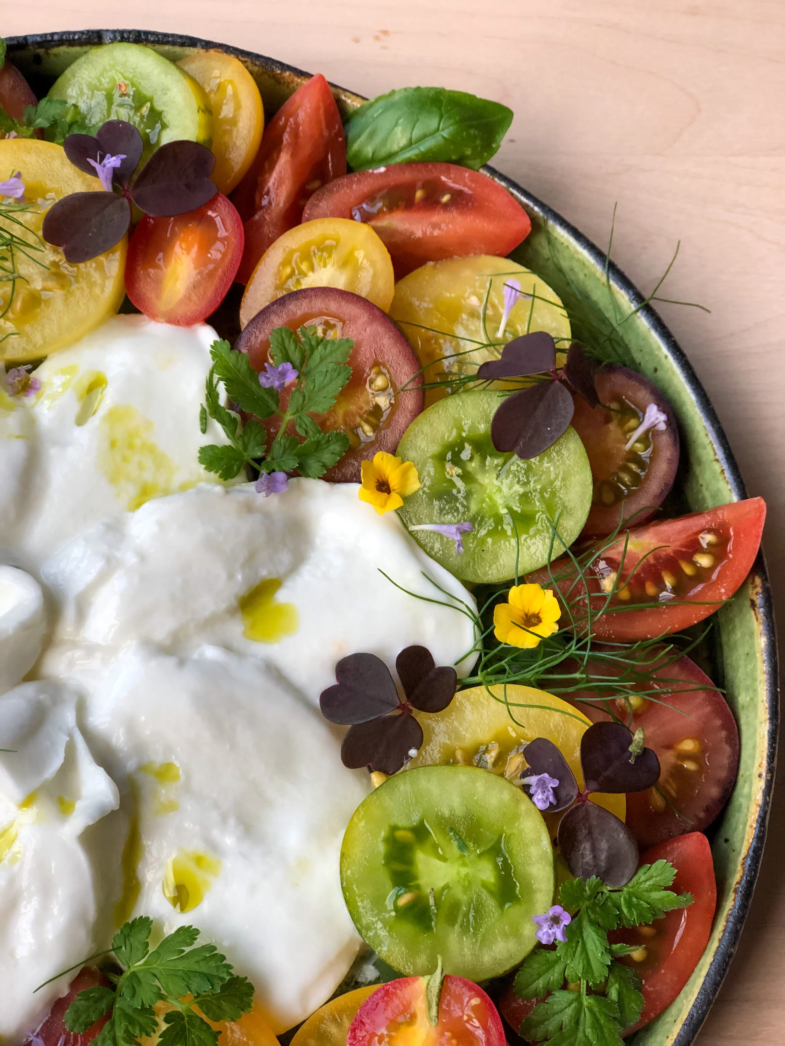 Finally our first tomatoes are ready to eat! Tonight we went all in for tomatoes. First a colourful insalata caprese with mozzarella di bufala, topped with Spanish chervil, fennel dill, oxalis and herb oil. It was as good tasting as looking!
